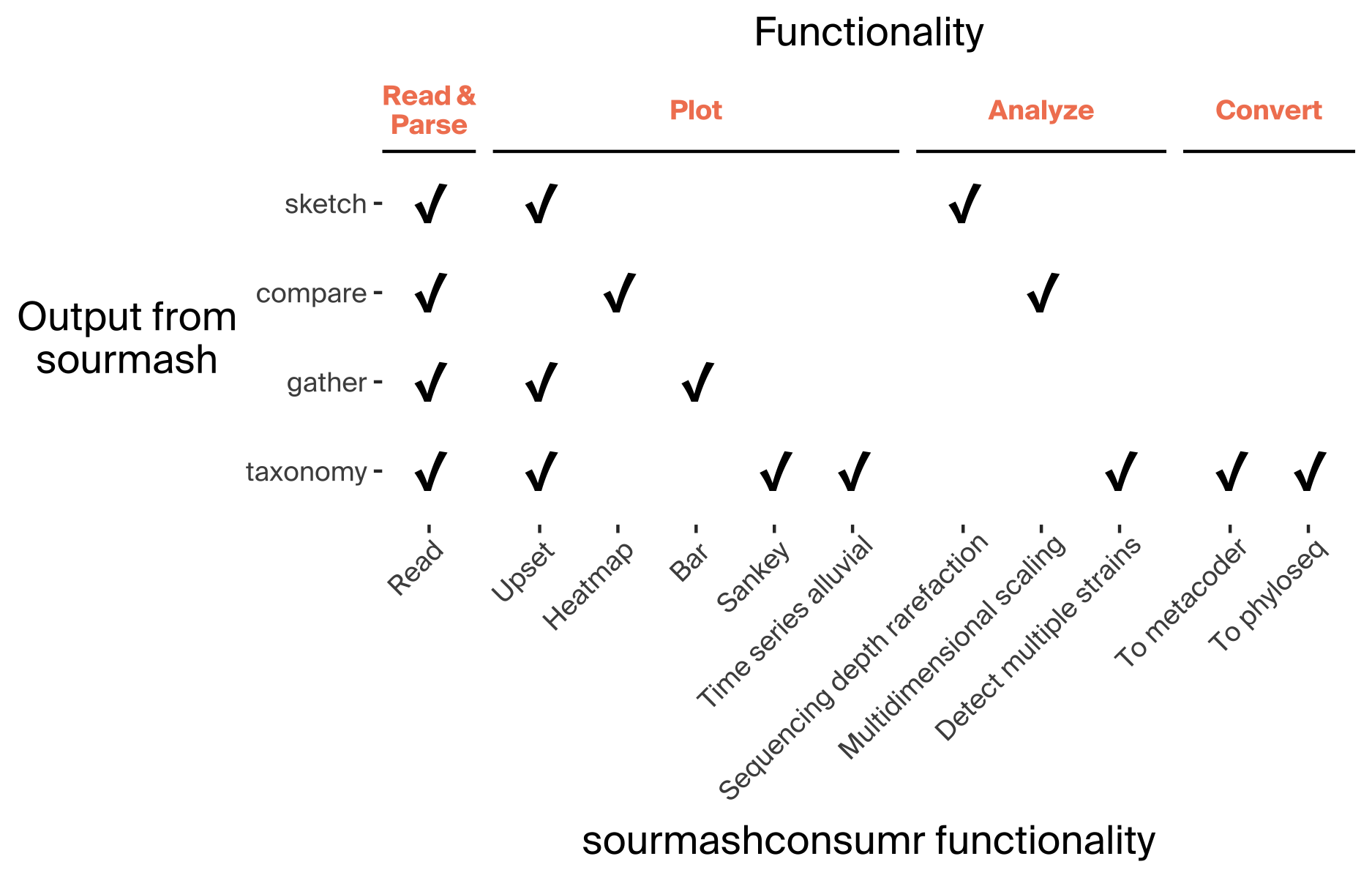 library(sourmashconsumr)The sourmashconsumr package contains a variety of functions to work with the outputs of the sourmash python package. The table below summarizes which sourmash outputs the sourmashconsumr package operates on and the functions that are available. For a complete list of functions in the sourmashconsumr package, see the documentation.