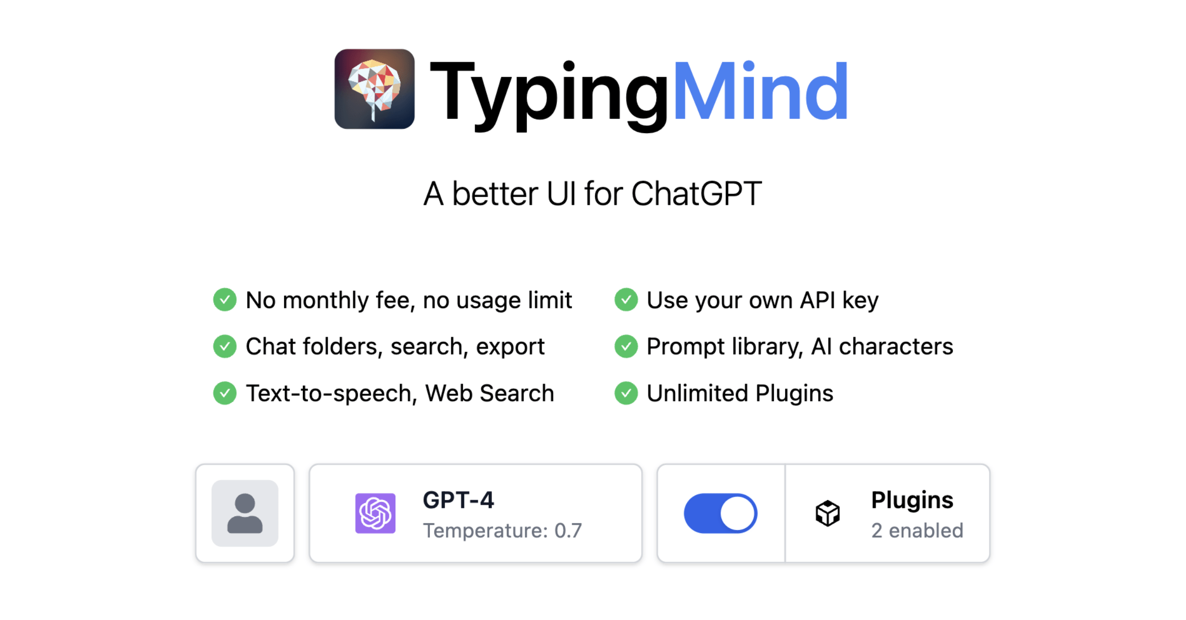 | π€ | TypingMind | The best advanced UI for ChatGPT/GPT-4/Claude. No monthly fee, no usage limit. Use your own API key. Advanced features: chat folders, search, export, prompt library, AI characters, Text-to-speech, Web Search, Plugins | 40% OFF with code BLACKFRIDAY2023 |