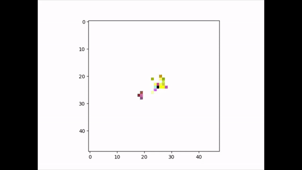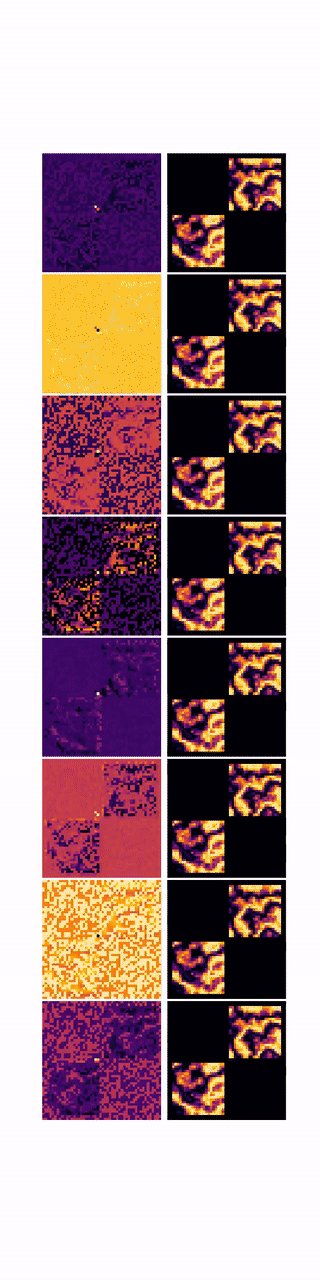 The ability to declaratively program a homogeneous computational medium is important because modern computer architectures do not scale well to highly parallel and distributed tasks. One day it is likely that chips with less explicit separation of concerns will take us much further than what is currently possible. It is an open question what kind of computational tasks systems like these can be programmed to perform. A primitive building block for more complex problems, is copying an input matrix from one location to another. From a high level this might seem like a trivial task. If you were building a physical circuit for this task alone it would be as simple as connecting all the inputs directly to the outputs with wires. However, given the constraints that this is a homogeneous computational medium, communication is only allowed between immediate neighbors, and there is a high chance of failure every time a message is posted, it's actually not so straightforward. It seems this system must need to execute some kind of bucket brigade algorithm in order to move the input data to the output. However it is possible for the CA to learn this with 4x4 and 8x8 matrices! It is easier to train 4x4 than 8x8. Larger that 12x12 has not been tried for this experiment yet. When visualizing the hidden states at high framerate, you can actually see the elements of the input matrix being consumed and streaming across the grid. To clarify - the model is not trained to copy any particular matrices. Every run of the simulation has a new random matrix of floats 0-1, and the CA must copy it regardless of its content. The first image is the input/output channel, the next three span the other 9 hidden channels.