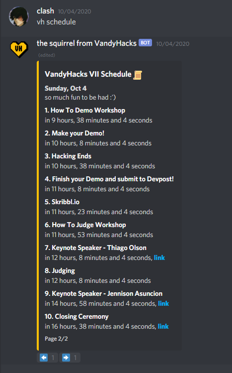 The Times cog (times.py) is the file that contain the very useful vh when and vh schedule commands. These commands display the event schedule as an interactive paginated embed with the time zone agnostic duration until the event.
