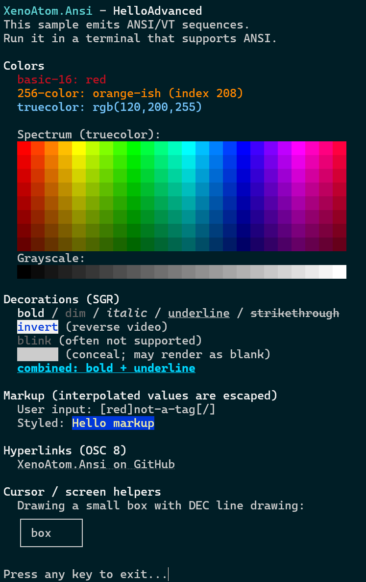 samples/HelloWorld— basic formatting across a few linessamples/HelloAdvanced— richer demo (colors, decorations, markup, OSC 8 links, screen helpers)