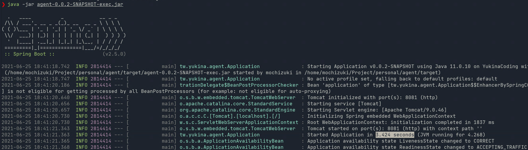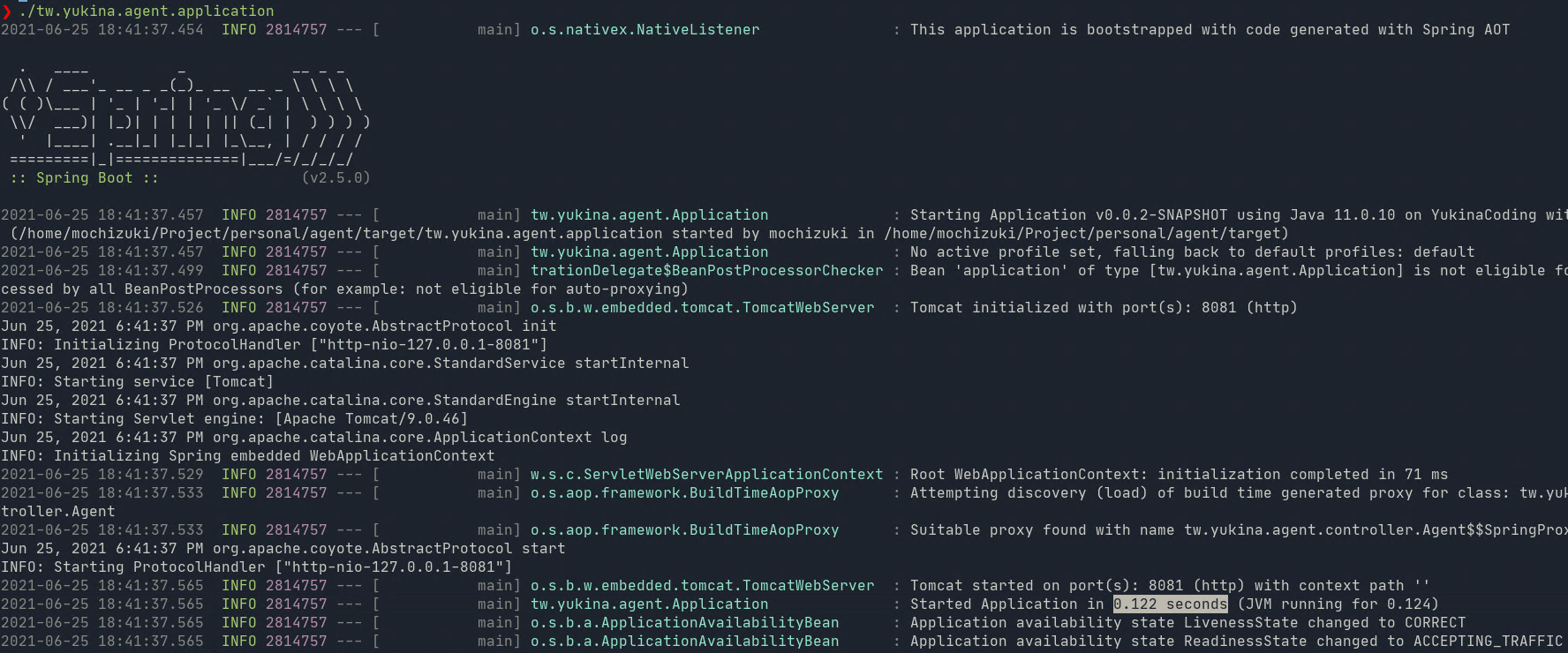 ./mvnw -Pnative-image packageThen native executable will be created in target folder and named tw.yukina.agent.application.