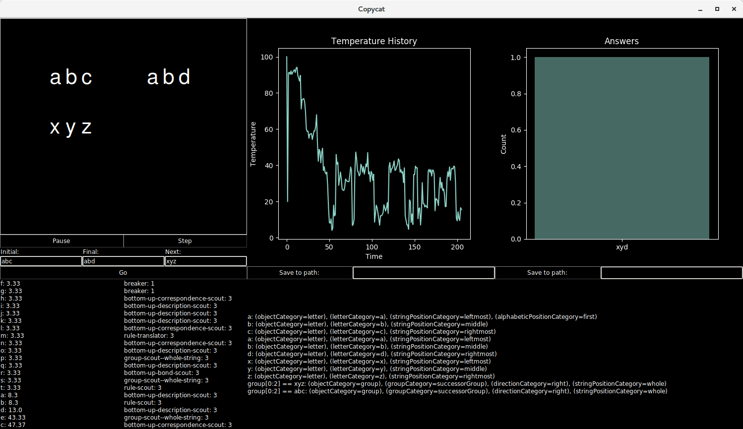 The first number indicates how many times Copycat chose that string as its answer; higher means "more obvious". The last number indicates the average final temperature of the workspace; lower means "more elegant".