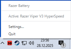 RazerTrayBattery is a lightweight application for monitoring the battery percentage of wireless Razer devices. It works independently and does not require Razer Synapse to be installed or running.