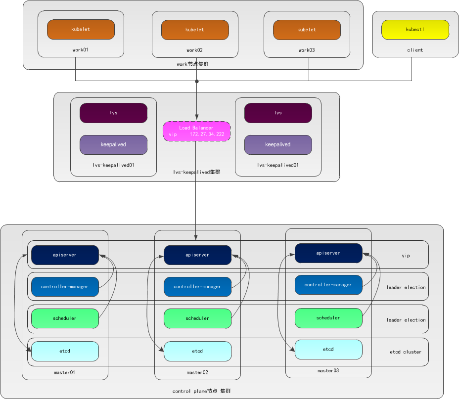 - apiserver 通过lvs-keepalived实现高可用,vip将请求分发至各个control plane节点的apiserver组件;
