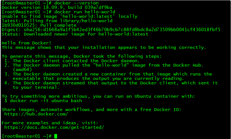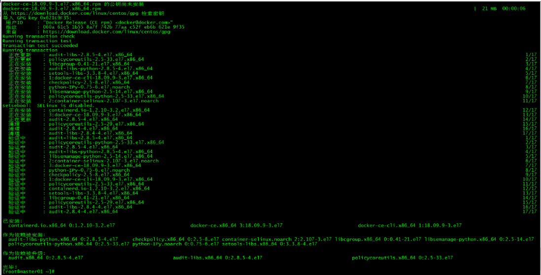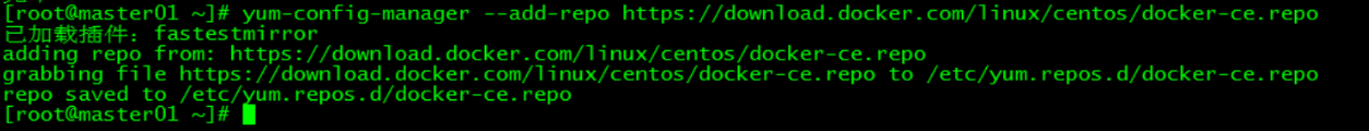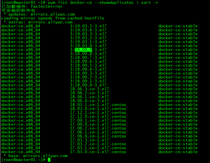 [root@master01 ~]# yum install -y yum-utils device-mapper-persistent-data lvm2[root@master01 ~]# yum-config-manager --add-repo https://download.docker.com/linux/centos/docker-ce.repo[root@master01 ~]# yum list docker-ce --showduplicates | sort -r[root@master01 ~]# yum install docker-ce-18.09.9 docker-ce-cli-18.09.9 containerd.io -y[root@master01 ~]# systemctl start docker