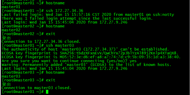 [root@master01 ~]# ssh master03master01可以直接登录master02和master03,不需要输入密码。