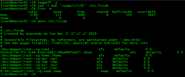 [root@master01 ~]# swapoff -a若需要重启后也生效,在禁用swap后还需修改配置文件/etc/fstab,注释swap