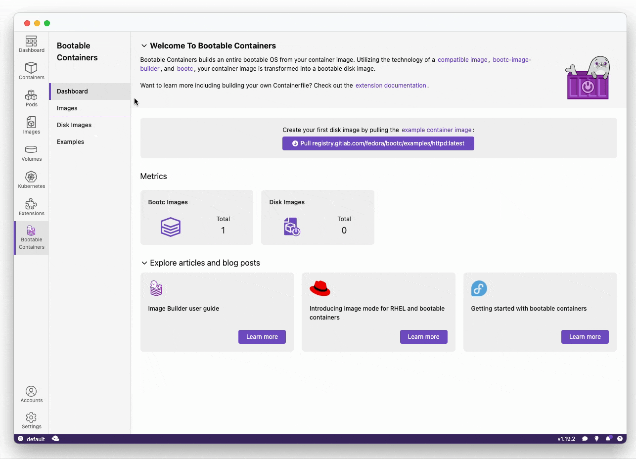 podman pull registry.redhat.io/rhel10/bootc-image-builder:10.1The extension dashboard shows example images you can use. You can pre-pull these as well: