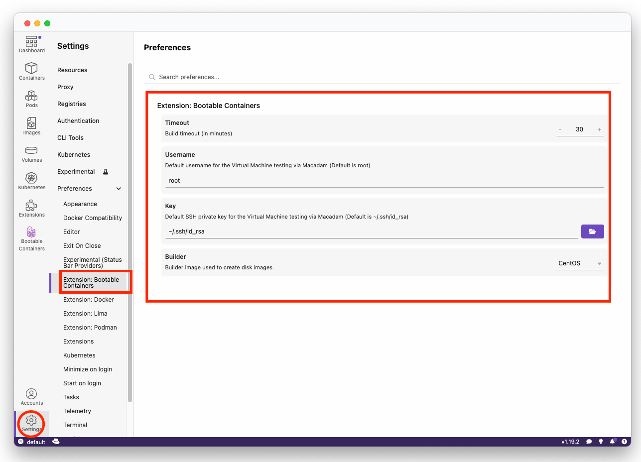 Preferences such as the default bootc-builder-image as well as timeouts can be adjusted within the Preferences section of Podman Desktop.