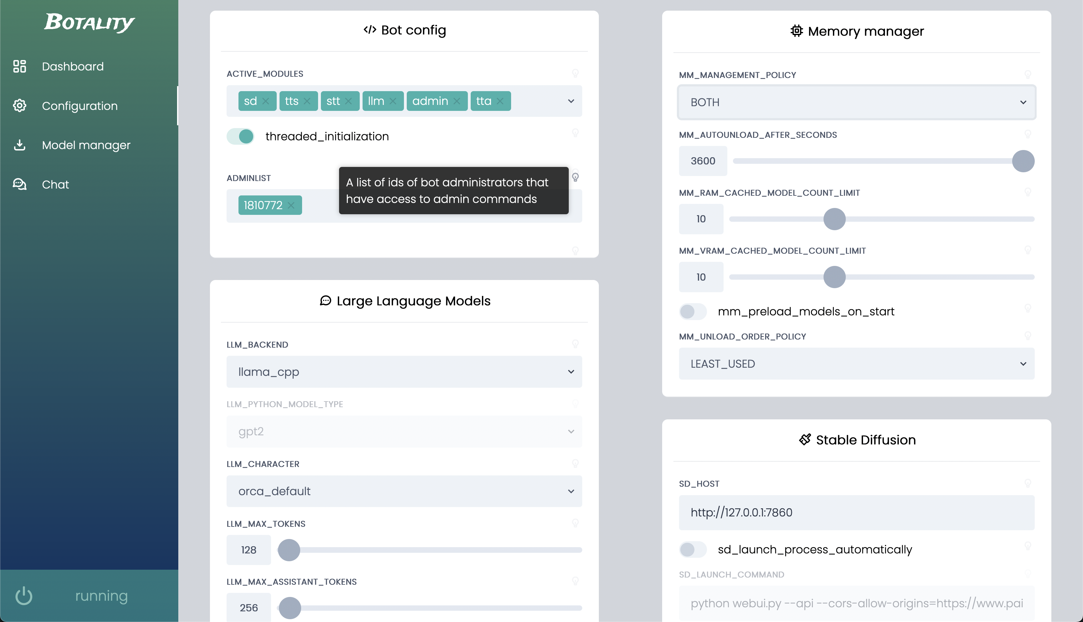 Send a message to your bot with the command /tti -h for more info on how to use stable diffusion in the bot, and /tts -h for tts module. The bot uses the same commands as voice names in configuration file for tts. Try /llm command for llm module details. LLM defaults to chat mode for models that support it, assistant can be called with /ask command