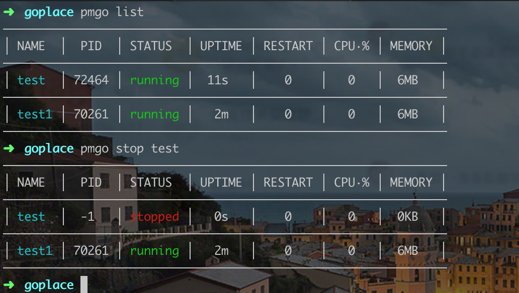 $ pmgo list # Display status for each app.