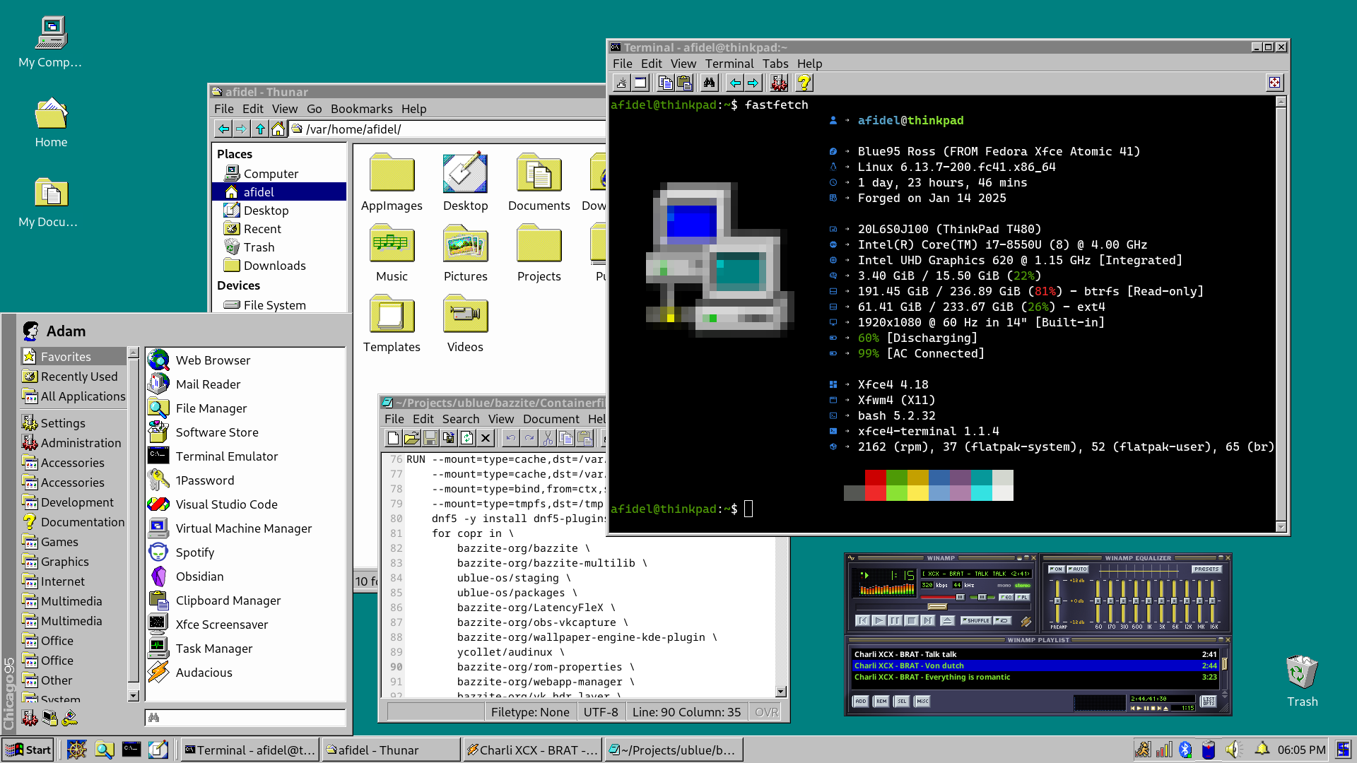 Blue95 is a modern and lightweight desktop experience that is reminiscent of a bygone era of computing. Based on Fedora Atomic Xfce with the Chicago95 theme.
