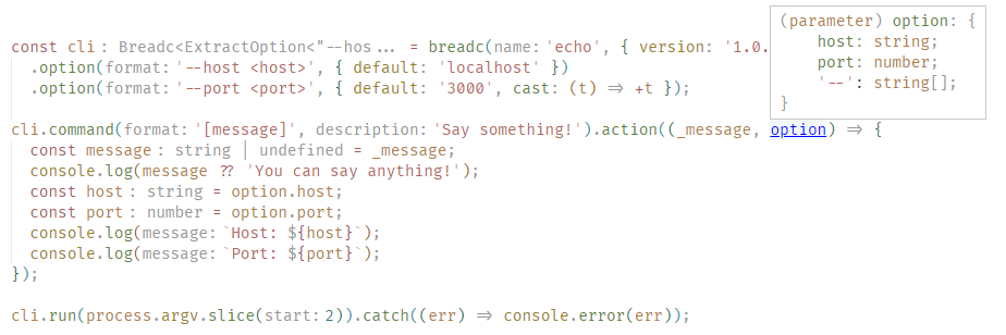 cli.run(process.argv.slice(2)).catch(err => console.error(err))If you are using IDEs that support TypeScript (like Visual Studio Code), input something using option, and then you will find the option is automatically typed with { host: string, port: number }. In the figure below, Visual Studio Code will automatically infer that the type of option.host is string and the type of option.port is number.